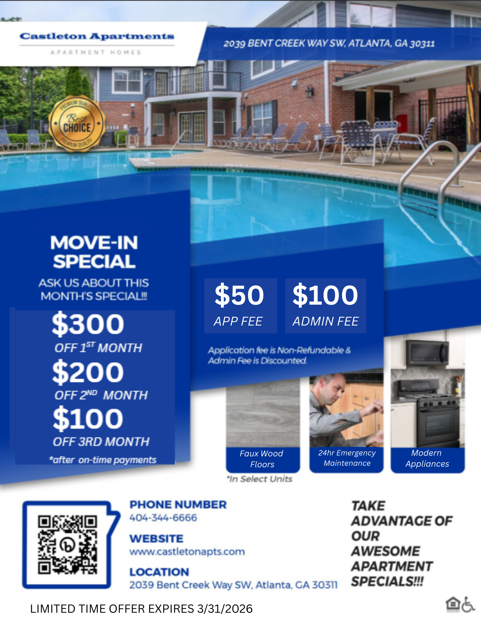 Spring is in the air!🌸Move into your new home this March and take advantage of our limited-time move-in specials. $300 OFF FIRST FULL MONTH’S RENT $200 OFF SECOND FULL MONTH’S RENT $100 OFF THIRD FULL MONTH’S RENT *Must Maintain On-Time Payments New season, new space, new savings — don’t miss your chance to make your move!